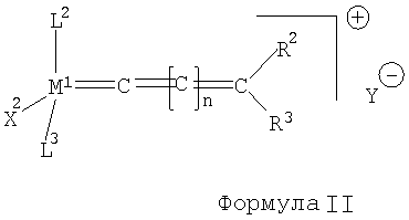 где М1 означает осмий или рутений, R2 и R3 независимо друг от друга означают атом водорода, остаток углеводорода, выбираемый из группы, включающей алкенильную группу с числом атомов углерода от двух до двадцати, алкинильную группу с числом атомов углерода от двух до двадцати, алкильную группу с числом атомов углерода от одного до двадцати, арильную группу, карбоксилатную группу с числом атомов углерода от одного до двадцати, алкоксигруппу с числом атомов углерода от одного до двадцати, алкенилоксигруппу с числом атомов углерода от двух до двадцати, алкинилоксигруппу с числом атомов углерода от двух до двадцати, арилоксигруппу, алкоксикарбонильную группу с числом атомов углерода от двух до двадцати, алкилтиольную группу с числом атомов углерода от одного до двадцати, алкилсульфонильную группу с числом атомов углерода от одного до двадцати и алкилсульфинильную группу с числом атомов углерода от одного до двадцати, X2 означает анионный лиганд и L2 означает нейтральный лиганд с L3 означает лиганд, выбираемый из группы, включающей фосфины, сульфонированные фосфины, фторированные фосфины, функционализированные фосфины, несущие до трех аминоалкильных, аммонийалкильных, алкоксиалкильных, алкоксикарбонилалкильных, гидроксикарбонилалкильных, гидроксиалкильных или кетоалкильных групп, фосфиты, фисфиниты, фосфониты, фосфинамины, арсины, стибены, простые эфиры, амины, амиды, имины, сульфоксиды, тиоэфиры и пиридины, Y– означает необразующий координационной связи анион, n означает целое число в пределах от 0 до 5;