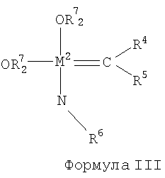 где М2 означает молибден или вольфрам, R4 и R5 независимо друг от друга означают атом водорода или остаток углеводорода, выбираемый из группы, включающей алкенильную группу с числом атомов углерода от двух до двадцати, алкинильную группу с числом атомов углерода от двух до двадцати, алкильную группу с числом атомов углерода от одного до двадцати, арильную группу, карбоксилатную группу с числом атомов углерода от одного до двадцати, алкоксигруппу с числом атомов углерода от одного до двадцати, алкенилоксигруппу с числом атомов углерода от двух до двадцати, алкинилоксигруппу с числом атомов углерода от двух до двадцати, арилоксигруппу, алкоксикарбонильную группу с числом атомов углерода от двух до двадцати, алкилтиольную группу с числом атомов углерода от одного до двадцати, алкилсульфонильную группу с числом атомов углерода от одного до двадцати и алкилсульфинильную группу с числом атомов углерода от одного до двадцати, R6 и R7 независимо друг от друга выбирают из любых незамещенных или галогензамещенных алкильных, арильных, арилалкильных групп или их аналогов, содержащих кремний;