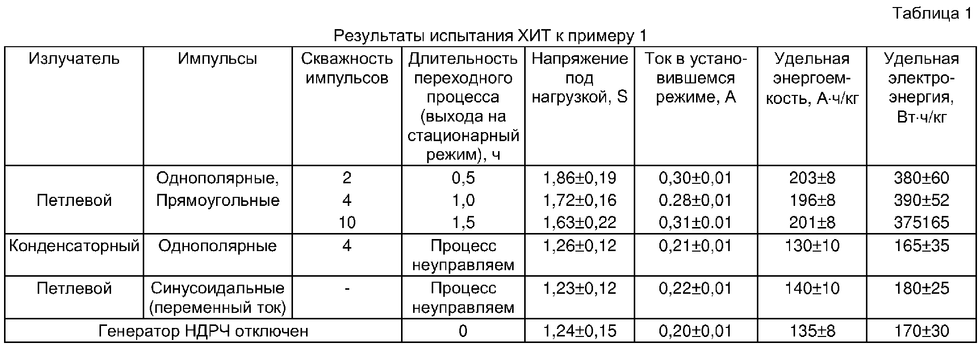 Изобретение относится к электрохимии и может быть использовано для интенсификации и управления электрохимических процессов преобразования химической энергии в электрическую, нанесения гальванических покрытий, анодирования и т.п. Известен способ интенсификации электрохимического процесса на примере источника постоянного тока, предусматривающий самовозбуждение внутренней электрической цепи путем покрытия анода биохимической смесью (RU 2158990, Н01М 8/16, Н01М 14/00, 2000). Известен также способ интенсификации электрохимических процессов при преобразовании химической энергии в электрическую путем уменьшения тока, протекающего через электроды, с помощью регулятора напряжения, установленного параллельно накопителю электроэнергии и нагрузке. Это снижает поляризацию электродов, а следовательно, и потери преобразования химической энергии в электрическую. Вместе с тем, снижение тока имеет следствием очевидную потерю электрической мощности, рассеиваемой в нагрузке. Другим направлением интенсификации электрохимических процессов является воздействие на электролит мощными физическими полями различной природы. В частности, для активации химического источника тока осуществляют световое облучение электролита (см., например: ЕР 1333524, Н01М 14/00, 2003). Однако данное воздействие малоэффективно и имеет ограниченную область применения. Основной тенденцией интенсификации электрохимических процессов физическими полями является формирование переменного воздействующего сигнала. Так, например, при нанесении гальванических покрытий широко используют воздействие на гальваническую ванну ультразвуковыми колебаниями частотой 25÷55 кГц мощностью от 0,01 до 1,0 Вт/дм2 с целью уменьшения поляризации электродов (JP 1092471, C25D 11/02, D01F 9/22, D06M 10/00, 1989; ЕР 0567042, C25D 5/20, C25D 3/32, 1993; KR 20020051336, C25D 5/20, 2002). При нанесении гальванических покрытий на изделия из стали, алюминия и других металлов производят последовательное осаждение слоя покрытия из электролита при прямой полярности тока с последующим удалением части этого покрытия при обратной полярности тока и заключительном осаждении покрытия при прямой полярности тока, причем на электролит в течение всего процесса воздействуют мощными ультразвуковыми колебаниями (1÷10 Вт/дм2) при частоте 22 кГц, а в покрываемом изделии дополнительно возбуждают ультразвуковые колебания резонансной частоты, при этом используют электролит, содержащий ультрадисперсную фазу (RU 2075557, C25D 15/00, C25D 5/20, 1997). Однако данный способ электроопасный, энергоемкий и сложный в эксплуатации. Наиболее близким к заявляемому является способ интенсификации электрохимических процессов путем импульсного управления, предусматривающего периодическое изменение направления тока, протекающего через электроды, при соотношении длительности прямого и обратного импульсов (10-60):1 и соответствующих прямому и обратному импульсам напряжений на электродах 1:(1,4÷1,6). Изобретательский замысел прототипного способа заключается в том, что при подаче импульсов обратного тока длительностью 1÷2 мин происходит деполяризация электрохимических ячеек, появляется равномерность распределения тока по площади электрода и связанное с этим более равномерное распределение температуры, что важно для исключения местных перегревов и связанной с этим бесперебойностью управляемого про