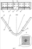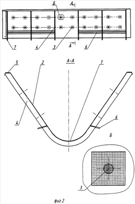 Изображенный на фиг.2 лоток водоотводной состоит из вогнутого дна 1, радиусная форма которого способствует эффекту самоочистки лотков за счет градиента скоростей потока, плоских наклоненных наружу под углом 35 градусов стенок 2 с выполненными в них дренажными отверстиями 3, поперечных ребер жесткости 4, выполненных снаружи по образующей стенок 2 и дна 1 на всем протяжении лотка кроме торцов, продольных ребер жесткости 5, выполненных снаружи по верхнему краю стенок 2 и поперечных ребер жесткости 4, а также якорных пластин 6, расположенных снаружи лотка горизонтально между поперечными ребрами жесткости 4, при этом дно 1 и стенки 2 лотка на одном из торцов имеют уширение 7. Якорные пластины 6 устанавливаются с обеих сторон лотка на нескольких или всех участках между ребрами 4. При этом для предотвращения заиливания лотка дренажные отверстия 3 выполнены решетчатыми, – в данном случае (что наиболее технологично) на них снаружи на связующем закреплены сетки 8 из полимерных материалов.
