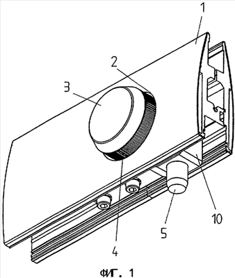 В профиле 1 предусмотрена круглая выемка 2, в которой размещена поворотная ручка 3. Выемка 2 охватывает поворотную ручку 3 с малым зазором, что позволяет практически полностью исключить попадание грязи или пыли в зазор между выемкой 2 и поворотной ручкой 3. Поворотная ручка 3 имеет на наружной боковой поверхности накатку или продольные рифления 4, обеспечивающие надежный захват ее пальцами руки, соответственно исключающие при ее вращении проскальзывание пальцев руки.