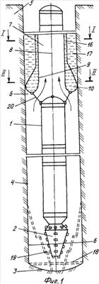 Для точного ориентирования канала 7 по оси 8 он оснащен по длине упругоподатливыми полыми выступами 16 в виде труб, между которыми образованы полости 17, отделяющие стенку канала 7 (фиг.2) от стенки выработки; при этом процесс проходки выработки осуществляют нормальной работой аппарата 1 при эвакуации бурового шлама по полости канала 7 к устью 5 и сохранении стенок 6 выработки устойчивыми при нахождении жидкости в полости 17.