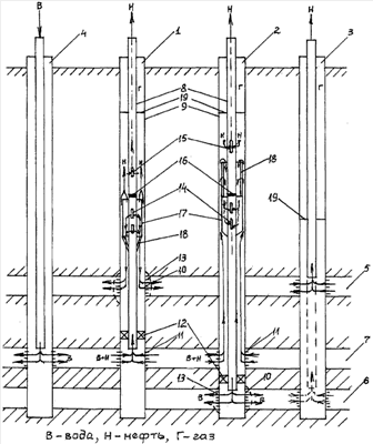 Для обоих случаев расположения пластов устройство скважин одинаково и содержит колонну насосных труб 8, спущенную в эксплуатационную колонну 9 с перфорированными участками 10 и/или 11 напротив менее проницаемого обводненного и более проницаемого продуктивных пластов, пакер 12, установленный в затрубном пространстве между данными пластами, каверну-накопитель 13 или без этой каверны. Данное устройство известно и применяется для раздельной или совместной добычи нефти из пластов как с насосами для подъема пластовой жидкости, так и/или без насосов (газлифтным, фонтанным или смешанных способами). Для решения задачи изобретения в скважину спускают колонну насосных труб 8, содержащую нижнюю насосную трубу с отверстиями 14, расположенную выше пакера 12 и продуктивных пластов 5-7 и гидродинамически связывающую через отверстия более проницаемый продуктивный пласт 7 по колонне насосных труб и затрубному пространству с вышележащим менее проницаемым пластом 5 или наоборот пласт 7 с нижележащим менее проницаемым пластом 6, образуя в затрубном пространстве зону отделения нефти от попутной воды обводненного продуктивного пласта; верхнюю насосную трубу с отверстиями 15, расположенную ниже динамического уровня жидкости 19 в скважине и выше нижней насосной трубы с отверстиями 14 и гидродинамически связывающую верхнюю часть затрубного пространства через отверстия и верхнюю часть колонны насосных труб с устьем скважины, образуя в верхней части затрубного пространства зону накопления отстоявшейся маловодной нефти; заглушку 16, исключающую движение жидкости в колонне насосных труб между нижней 14 и верхней 15 насосными трубами с отверстиями.
