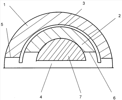 Залежь 1 отделена от залежи 2 тонкой глинистой перемычкой 3. Залежи 1 и 2 имеют общий гидродинамический бассейн 4. Водонефтяной контакт 5 залежи 1 ниже водонефтяного контакта 6 залежи 2. Гидродинамический бассейн 4 расположен под массивным неколлектором 7.