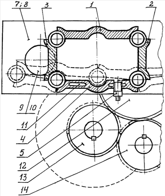 Предлагаемый четырехзвенный ДВС представляет собой пространственный четырехзвенник, содержащий три 1; 2; 3 подвижных звена и одно неподвижное 4 со свечой зажигания 5, соединенные между собой пальцами 6, расположенный между двумя параллельными стенками 7, 8, одна из которых имеет впускной 9, другая – выпускной 10 клапаны. Неподвижное звено и стенки имеют каналы (или рубашку) для жидкостного охлаждения 11. Один из пальцев неподвижного звена жестко соединен с подвижным звеном, воспринимает от него крутящий момент и передает его на зубчатое колесо 12, соединенное с шестернями 13 и 14, одна из которых вращает маховик.