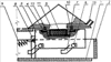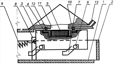 Предлагаемое пробоподающее устройство изображено на чертеже и состоит из корпуса 1, в котором может перемещаться подвижная рама 2 вместе с кареткой 3, в которой имеется установочная ячейка для кюветы 4 с пробой 5. Каретка имеет опорные ролики 6, которые располагаются в направляющих 7 подвижной рамы 2. По этим направляющим каретка 3 может подниматься относительно подвижной рамы 2 при соприкосновении с вертикальным упором 8. Для возврата каретки в нижнее положение имеется пружина 9. Верхняя крышка 10 с отверстием и с размещенными в ней полупроводниковым детектором и источником возбуждения характеристического рентгеновского излучения (не показаны) является элементом вакуумного спектрометра, называемым модулем рентгенооптической схемы. В верхней крышке 10 также имеется канал 13 для откачки внутреннего объема 11 модуля рентгенооптической схемы. Для этой цели в верхней крышке напротив кюветы имеется вакуумное уплотнительное кольцо 12, а толщина стенки кюветы 4 позволяет при соприкосновении с этим уплотнением осуществить герметизацию внутреннего объема модуля рентгенооптической схемы. На чертеже показано положение каретки 3, когда кювета 4 с пробой 5 находится в положении измерения, т.е. проба 5 находится внутри этого объема. Положение, при котором каретка находится за пределами этого положения, располагается справа от изображенного положения, и в него каретка переходит при движении подвижной рамы 2 также в правое положение благодаря наличию специального двигателя (не изображен). При таком перемещении каретка 3 опускается вниз по пазам 7 подвижной рамы 2 благодаря наличию пружины 9, один конец которой закреплен к каретке 3, а другой конец – к подвижной раме 2 (не показано).