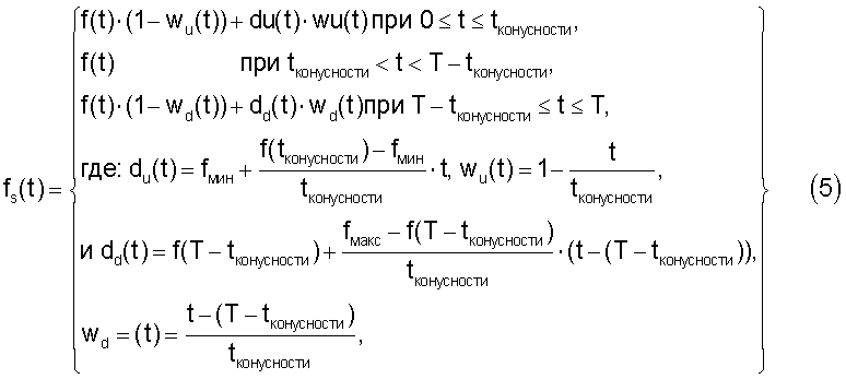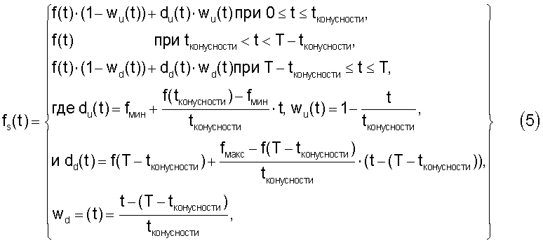 где f(t) – мгновенная частота исходного свип-сигнала, Wu и соответствующие весовые функции, fmin и fmax – частотные границы, задаваемые пользователем, tконусности – длительность конусности, du и dd – линейные частотные функции в областях соответственно подъема и спуска по конусу, d(t) – линейная затухающая функция.