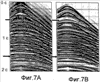На фиг.7А и 7В отображены коррелированные данные (из фиг.6А и 6В) после коррелирования с линейным свип-сигналом (фиг.7А) и с профилированным свип-сигналом (фиг.7В). Повышение качества данных при использовании профилированного свип-сигнала является очевидным. Данные по линейному свип-сигналу кажутся “зашумленными” по сравнению с данными по профилированному свип-сигналу. Вступление первой волны в данных по профилированному свип-сигналу намного более отчетливое и более хорошо выражено, чем в данных по линейному свип-сигналу, и может быть полезным для уточнения статических поправок. Кроме того, боковые лепестки высокого уровня в данных по линейному свип-сигналу маскируют слабые отражения, которые ясно видны в данных по профилированному свип-сигналу (отмечены стрелками).