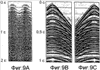 На фиг.6А и 6В показана первая часть исходных данных по каскадному свип-сигналу, полученных для одной и той же геологической модели путем использования линейного свип-сигнала (фиг.6А) и свип-сигнала, спрофилированного согласно способам настоящего изобретения (фиг.6В). Данные имеют нелинейные искажения пятого порядка, пять сегментов плюс период прослушивания на протяжении длительности, при этом длительность каждого сегмента и периода прослушивания составляет четыре секунды. Начальные фазы сегментов равны 0, 144, 288, 72 и 216°.