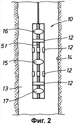Набор антенных решеток («антенная решетка») расположен вокруг проводящей оправки 51 в скважинном каротажном устройстве 10. Хотя использование проводящей оправки считалось нежелательным для индукционных скважинных каротажных устройств, Barber и др. доказали, что проводящая оправка (например, из меди или нержавеющей стали) может использоваться в индукционных каротажных устройствах и обеспечивать более надежное и прочное устройство. Подробно см. патенты США №№4651101 и 4873488, Barber и др. Как показано на Фиг.2, антенная решетка может содержать передатчик 15, верхний приемник 16 и нижний приемник 17. Передатчик 15 и приемники 16 и 17 могут быть ПМД-, НМД-устройствами или их комбинациями. Эти передатчики и приемники являются типичными антеннами на непроводящих опорных элементах, и антенны вместе с опорными элементами тогда располагаются вокруг проводящей оправки. Антенны могут быть антеннами соленоидного типа, рамочными антеннами или катушечной конструкцией, создающей поперечный магнитный диполь.