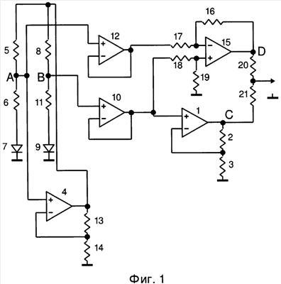 Пятый операционный усилитель 15 с петлей обратной связи на девятом резисторе 16 и десятом резисторе 17 и с третьей цепью на одиннадцатом резисторе 18 и двенадцатом резисторе 19 представляет собой дифференциальный усилитель, входными сигналами для которого являются потенциалы в точках А и В, так как потенциал на выходе четвертого операционного усилителя 12 равен потенциалу узла А, а потенциал на выходе третьего операционного усилителя 10 равен потенциалу узла В.