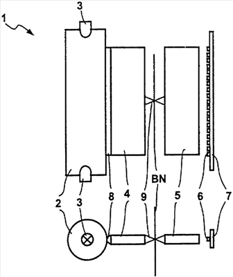 На этом чертеже показана принципиальная схема устройства 1 для проверки банкнот BN при взгляде на него в направлении транспортировки проверяемых банкнот, а также в виде сбоку.