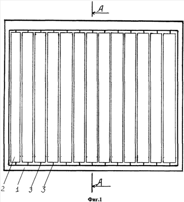 Заявляемое техническое решение поясняется чертежами, где на фиг.1 представлен вид спереди заявляемого устройства, на фиг.2 – поперечный разрез А-А фиг.1 устройства, на фиг.3 – вид сверху заявляемого устройства. Позициями на чертежах обозначены: