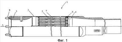 Важным элементом для обеспечения поджатия кассеты 1 является местоположение упоров 8, а следовательно, и расточек 10 под них, на верхнем торце головной части 3 рабочей кассеты 1 и их размеры. Важным условием, которое должно быть соблюдено при определении такого местоположения, является условие сохранения прочности головной части 3 кассеты при обеспечении максимально возможной глубины расточки для обеспечения рабочего хода каждой пружины 9 до 100 мм, как уже было отмечено выше, при одновременном максимальном удалении местоположения расточек 10 от центральной оси рабочей кассеты 1. Исходя из этого условия было определено, что максимально возможная глубина расточки 10, обеспечивающая достаточную прочность головной части 3, предпочтительно составляет около 140 мм при расположении центров расточки по окружности на верхнем торце головной части с диаметром 130-137 мм.