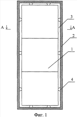 На фигуре 1 представлен чертеж отражателя нейтронов ядерного реактора СМ, на фигуре 2 – горизонтальное сечение. Отражатель нейтронов состоит из бериллиевого блока, составленного в данном случае из трех частей (1), которые размещены последовательно друг за другом по высоте внутри герметичного чехла (2) с зазором (3) между бериллиевым блоком и внутренней поверхностью чехла, который поддерживается дистанционаторами (4). Представленный вариант конструкции отражателя нейтронов из бериллия соответствует существующей компоновке активной зоны реактора СМ. Поперечное сечение отражателя прямоугольное, он расположен более протяженной стороной к активной зоне реактора. При высоте активной зоны реактора СМ 350 мм общая длина бериллиевого блока из трех частей составляет 500 мм. Эффективным размером бериллиевого блока в данном случае является ширина блока в направлении активной зоны, которая имеет величину 26 мм. Соответственно, минимальная величина зазора между бериллиевым блоком и внутренней поверхностью чехла составит 0,26 мм. Теплофизические расчеты показывают, что в случае использования в зазоре газа криптон величина зазора составит 0,8 мм при давлении 0,1 МПа. В качестве дистанционаторов использованы V-образные упругие элементы, выполненные из нержавеющей стали Х13. Толщина чехла в случае изготовления из сплава алюминия САВ-1 составит 1,2 мм, из сплава циркония Э110 – 1 мм.