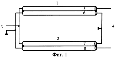 Симметрирующее устройство работает следующим образом. Несимметричное напряжение, поступающее на вход 3, фиг.1, можно представить наложением двух волн – двухтактной (симметричной) и однотактной. Для двухтактной волны экранированные линии передачи 1 и 2 являются согласованными, и она беспрепятственно проходит на выход 4. Для однотактной волны свернутые в спирали экранированные линии передачи представляют большое сопротивление, и она подавляется. Чем больше упомянутое сопротивление, тем больше подавляется однотактная волна и тем лучше согласование и симметрия. В прототипе для увеличения упомянутого сопротивления экранированные линии передачи намотаны на ферритовый сердечник. В предлагаемом симметрирующем устройстве вместо использования ферритового сердечника увеличено число витков. Однако простое увеличение числа витков или их диаметра привело бы к увеличению габаритов устройства, и, следовательно, к увеличению его собственной емкости, из-за чего уменьшилась бы частота последовательного резонанса, при котором сопротивление для однотактной волны становится низким и частотный диапазон устройства, тем самым, уменьшается. Выполнение экранированной линии передачи в виде двухслойной спирали с чередованием витков внешнего и внутреннего слоев позволяет увеличить сопротивление для однотактной волны без увеличения габаритов при незначительном увеличении собственной емкости, поскольку напряжение между ближайшими друг к другу витками мало. При обычной двухслойной намотке без чередования витков это напряжение было бы равно или полному приложенному на вход напряжению или его половине, в зависимости от того, как выполнен переход от одного слоя к другому; это привело бы к увеличению собственной емкости и к снижению электрической прочности устройства, т.е. к уменьшению пропускаемой мощности. В этом случае нужный технический результат не был бы получен. В заявляемом устройстве, благодаря упомянутому выше выполнению экранированных линий передачи, возможно получение хороших согласования и симметрии без ферритового сердечника, что позволяет избежать потерь мощности в сердечнике и его перегрева и, тем самым, увеличить мощность, пропускаемую симметрирующим устройством. На фиг.4 показан график собственного КБВ предлагаемого симметрирующего устройства в зависимости от частоты. Данные графика получены экспериментально на опытном образце устройства, рассчитанного на пропускаемую мощность 5 кВт.
