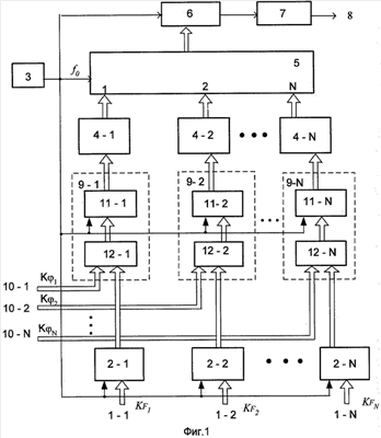 через буферные регистры 11-1, 1-2,…,11-N памяти, тактируемые частотой f0 ОГ, поступает на соответствующие входы преобразователей 4-1, 4-2,…,4-N кода фазы.