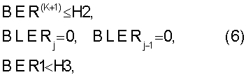– для очередного кадра выбирают скорость передачи VK+1 при одновременном выполнении следующих условий: скорость передачи текущего кадра VK не максимальна, вероятность блоковой ошибки для текущего j-го и предыдущего (j-1)-го кадров BLERj, BLERj-1 равны нулю, средняя вероятность битовой ошибки BER(K+1) для скорости передачи VK+1 не превосходит второго порога Н2, повышающая прогнозная величина BER1 не превосходит третьего порога Н3;
