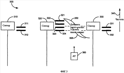 На фиг. 3 показан вариант осуществления различных секторов и ассоциированных пилот-сигналов в системе 300 связи с множеством несущих. Система 300 может в общем случае включать в себя любое число секторов, каждый из которых ассоциирован с одним или более пилот-сигналов, имеющих различные частоты. Для иллюстрации и ясности в явном виде показаны три сектора 310, 320, 330. Также для примера показаны пилот-сигналы 311, 312, ассоциированные с сектором 310, пилот-сигналы 321-324, ассоциированные с сектором 320, и пилот-сигналы 331, 332, ассоциированные с сектором 330. Эти пилот-сигналы показаны относительно частотной оси 340, указывая, что пилот-сигналы, ассоциированные с данным сектором, имеют разные частоты.