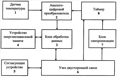 Особенностью является то, что в него введены последовательно соединенные согласующее устройство, узел двусторонней связи, блок синхронизации и таймер, датчик температуры подключен через первый вход аналого-цифрового преобразователя к блоку обработки данных, связанному с устройством энергонезависимой памяти, а выход таймера соединен со вторым входом аналого-цифрового преобразователя, при этом второй вход таймера соединен со вторым выходом узла двусторонней связи.