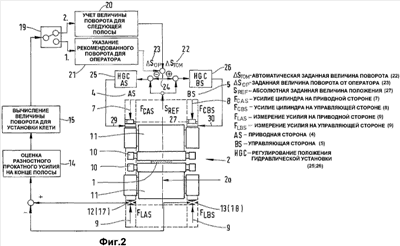 Кроме того, к вычислительному блоку 15 подключено разветвление 19 (смотри фиг.2) для дальнейшего направления величины 16 поворота либо в автоматическое устройство 20 для учета в текущей или следующей металлической катаной полосе 1 и/или в индикатор 21 в качестве рекомендации поворота для оператора. В соответствии с этим заданная величина 23 автоматического поворота для оператора направляется в разветвление 24, в котором величины направляются в устройство 25 регулирования положения гидравлической установки приводной стороны (валков) и в устройство 26 регулирования положения гидравлической установки на управляющей стороне 5. Заданные величины 22 и 23 поворота прибавляются или вычитаются из абсолютной заданной величины 27 положения.