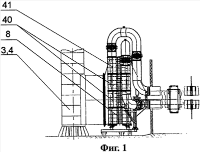 Корпус коллектора подвода 3 или отвода 4 воздуха выполняют круглоцилиндрическим с внутренним диаметром предпочтительно 650÷1200 мм. Корпус коллектора подвода 3 или отвода 4 воздуха оснащают ступеньками для обслуживания и ремонта участков теплообменных труб, по крайней мере, в зоне присоединения их к трубной доске 6, при этом ступеньки располагают преимущественно на внутренней стороне корпуса и выполняют предпочтительно в виде скоб. При изготовлении коллектора подвода 3 или коллектора отвода 4 воздуха нижнего теплообменного блока 51 корпус коллектора подвода 3 или отвода 4 воздуха выполняют с люком-лазом (на чертежах не показано), который выполняют в боковой стенке корпуса коллектора подвода 3 или отвода 4 воздуха и снабжают съемной или откидной крышкой 59. Для выполнения люка-лаза в боковую стенку корпуса вваривают патрубок диаметром, составляющим 0,5÷0,95 диаметра корпуса коллектора подвода 3 или отвода 4 воздуха, а крышку 59 выполняют в виде плоской заглушки или криволинейной, преимущественно двоякой кривизны оболочки, или люк-лаз выполняют в нижнем торце корпуса и закрывают крышкой 59, которую выполняют с возможностью поворота предпочтительно в плоскости расположения нижнего торца корпуса или в параллельной ей плоскости для открывания люка-лаза.