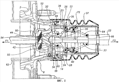 Усилитель имеет также толкатель 48, который расположен на одной оси с управляющим стержнем 22 между плунжером и главным тормозным цилиндром (на чертежах не показан). Толкатель 48 имеет расположенный на его первом заднем продольном конце 50 колпачок 52 с воспринимающей усилие торможения и создающей усилие противодействия шайбой 55, задний торец которой обращен ко второму переднему продольному концу 54 плунжера 32 (называемому чувствительным элементом усилителя) и переднему концу 56 пневматического поршня.