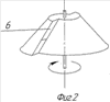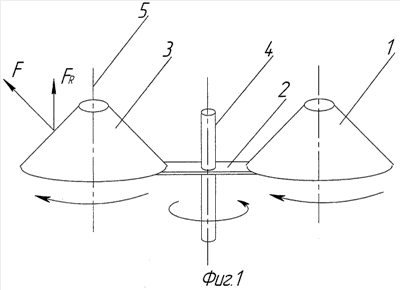 на фиг.3 – схема взаимодействия динамического несущего элемента конусоидальной формы, выполненного с возможностью вращения продольной оси под углом к оси вращения;