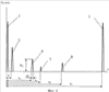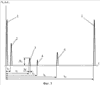 В качестве примера на фиг.3 представлена временная диаграмма импульсов ультразвуковых сигналов, поступающих на вход амплитудных детекторов от работающего пьезопреобразователя при отсутствии образовавшегося слоя солей кальция и магния на поверхности мембраны со стороны катода, где кривая 1 является излучающим от пьезопребразователя сигналом, а кривая 2 – импульсом эхо-сигнала от поверхности раздела сред электрод катода – катодное пространство электролизера, далее: 3 – импульс эхо-сигнала от поверхности раздела сред катодное пространство – мембрана, который имеет амплитуду A1, 4 – импульс эхо-сигнала от поверхности раздела сред мембрана – анодное пространство, 5 – импульс эхо-сигнала от поверхности раздела сред анодное пространство – электрод анода. По оси абсцисс отложено время распространения ультразвукового сигнала, при этом интервал времени t1 соответствует приходу на пьезопреобразователь эхо-сигнала 2, t2 соответствует времени прихода сигнала 3, амплитуда которого контролируется пороговым устройством 25 (фиг.2), t3 соответствует времени прихода эхо-сигнала 4, t4 соответствует времени прихода эхо-сигнала 5, t5 соответствует времени посылки следующего возбуждающего импульса на пьезопреобразователь, a 1/t5 является частотой работы синхрогенератора 17 (фиг.2).