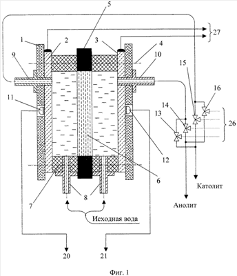 В зависимости от полярности поданного напряжения на электроды от источника 26 коммутатором 20 подается возбуждение только на тот пьезопреобразователь, который расположен на отрицательном электроде (катоде). Например, отрицательное напряжение подано на электрод 2, а положительное – на электрод 3, т.е. электрод 2 является катодом, а электрод 3 – анодом. При этом из патрубка 9 будет вытекать католит, а из патрубка 10 – анолит. Вода через патрубки 8 подается в пространство между электродами 2 и 3. При наложении направленного электрического поля происходит разделение воды на католит и анолит. По ходу протекания химических процессов в обрабатываемой воде соли, содержащиеся и не растворимые в ней, частично осаждаются и уплотняются на поверхности мембраны 6 со стороны катода, в данном случае – электрода 2, что затрудняет протекание электролиза, снижая производительность аппарата и со временем надежность его работы.