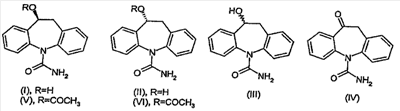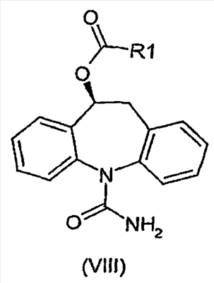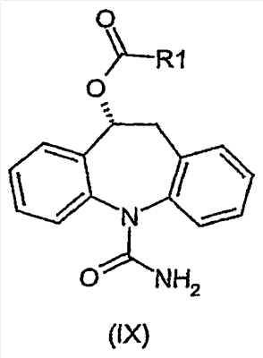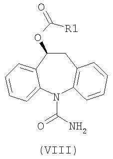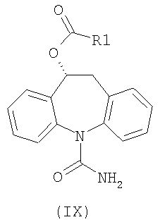 где R1 означает водород, алкил, галогеналкил, аралкил, циклоалкил, циклоалкилалкил, алкокси, арил или пиридил; термин алкил означает линейную или разветвленную углеводородную цепь, содержащую от 1 до 18 атомов углерода; термин галоген означает фтор, хлор, бром или йод; термин циклоалкил означает алициклическую насыщенную группу, содержащую от 3 до 6 атомов углерода, и термин арил означает незамещенную фенильную группу или фенил, замещенный алкокси, галогеном или нитрогруппой, включающий: (a) получение рацемического (±)-10,11-дигидро-10-гидрокси-5Н-дибенз[b,f] азепин-5-карбоксамида из оптически чистого или оптически обогащенного (R)-(-)-10,11-дигидро-10-гидрокси-5Н-дибенз[b,f] азепин-5-карбоксамида (II) способом по п.3; или (b) получение рацемического (±)-10,11-дигидро-10-гидрокси-5Н-дибенз[b,f]азепин-5-карбоксамида из оптически чистого или оптически обогащенного (S)-(+)-10,11-дигидро-10-гидрокси-5Н-дибенз [b,f] азепин-5-карбоксамида (I) способом по п.4; затем, после проведения стадии (а) или (b) (c) разделение рацемического (±)-10,11-дигидро-10-гидрокси-5Н-дибенз [b,f] азепин-5-карбоксамида с выделением (S)-(+)-10,11-дигидро-10-гидрокси-5Н-дибенз[b,f]азепин-5-карбоксамида (I), с последующим ацилированием выделенного энантиомера с получением соединения формулы (VIII). 12. Способ получения соединения общей формулы (IX):