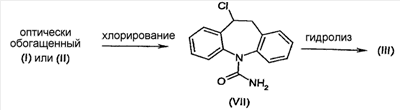 2. Способ получения соединения VII по п.1, включающий взаимодействие оптически чистого или оптически обогащенного (R)-(-)-10,11-дигидро-10-гидрокси-5Н-дибенз[b,f]азепин-5-карбоксамида (II) или взаимодействие оптически чистого или оптически обогащенного (S)-(+)-10,11-дигидро-10-гидрокси-5Н-дибенз[b,f]азепин-5-карбоксамида (I) с хлорирующим реагентом в, по существу, инертном растворителе с получением соединения формулы (VII). 3. Способ рацемизации оптически чистого или оптически обогащенного (R)-(-)-10,11-дигидро-10-гидрокси-5Н-дибенз[b,f]азепин-5-карбоксамида (II), включающий: (а) взаимодействие оптически чистого или оптически обогащенного (R)-(-)-10,11-дигидро-10-гидрокси-5Н-дибенз[b,f]азепин-5-карбоксамида (II) с хлорирующим реагентом в, по существу, инертном растворителе с получением промежуточного соединения формулы (VII), и (b) гидролиз полученного промежуточного соединения формулы (VII) с образованием рацемического (±)-10,11-дигидро-10-гидрокси-5Н-дибенз [b,f] азепин-5-карбоксамида (III). 4. Способ рацемизации оптически чистого или оптически обогащенного (S)-(+)-10,11-дигидро-10-гидрокси-5Н-дибенз[b,f]азепин-5-карбоксамида (I), включающий: (a) взаимодействие оптически чистого или оптически обогащенного (S)-(+)-10,11-дигидро-10-гидрокси-5Н-дибенз[b,f]азепин-5-карбоксамида (I) с хлорирующими реагентами в, по существу, инертном растворителе с получением промежуточного соединения формулы (VII), и (b) гидролиз полученного промежуточного соединения формулы (VII) с образованием рацемического (±)-10,11-дигидро-10-гидрокси-5Н-дибенз [b,f]азепин-5-карбоксамида (III). 5. Способ по пп.2, 3 или 4, в котором хлорирующий реагент выбран из тионилхлорида, оксалилхлорида, сульфурилхлорида, пентахлорида фосфора, трихлорида фосфора или оксихлорида фосфора. 6. Способ по пп.2, 3 или 4, в котором, по существу, инертным растворителем является хлорированный алифатический или ароматический углеводородный растворитель. 7. Способ по п.5, в котором, по существу, инертным растворителем является хлорированный алифатический или ароматический углеводородный растворитель. 8. Способ по п.3 или 4, в котором гидролиз промежуточного продукта (VII) проводят в чистой воде. 9. Способ по п.3 или 4, в котором гидролиз промежуточного соединения (VII) проводят в смеси вода – смешивающийся с водой растворитель. 10. Способ по п.9, в котором смешивающийся с водой растворитель выбран из диоксана, тетрагидрофурана, метанола, этанола, изопропанола, N-метил-2-пирролидинона, высокомолекулярных полиэтиленгликолей, ацетона, ацетонитрила и диметилформамида. 11. Способ получения соединения общей формулы (VIII):