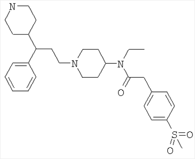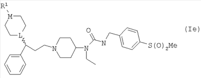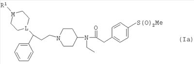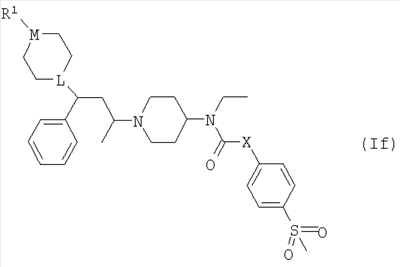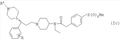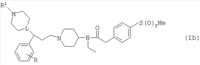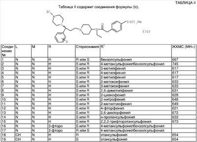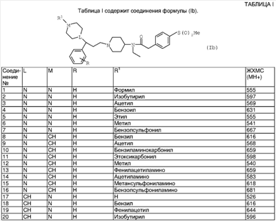 ПРИМЕР 1 Этот пример иллюстрирует получение N-[1-(3-фенил-3-[4-метилпиперазин-1-ил]пропил)пиперидин-4-ил]-N-этил-4-метансульфонилфенилацетамида (Соединения №6 из Таблицы I). К раствору 1-метилпиперазина (42 мкл; 0,38 ммоль) в DCM (10 мл) добавляли триэтиламин (0,1 мл; 0,72 ммоль), затем N-[1-(3-фенил-3-хлорпропил)пиперидин-4-ил]-N-этил-4-метансульфонилфенилацетамид (Способ А; 180 мг, 0,38 ммоль) и иодид натрия (50 мг). Получающуюся смесь перемешивали при комнатной температуре в течение 48 ч, затем промывали водой и солевым раствором, высушивали (MgSO4) и упаривали. Остаток очищали путем элюирования через 20 г BondElut 10%-ным метанолом в этилацетате, затем метанолом, затем 1%-ным триэтиламином в метаноле с получением указанного в заголовке соединения (58 мг). ЯМР: 1.2 (t, 1H), 1.3 (t, 2Н), 1.4 (m, 1H), 1.6 (m, 2H), 1.8 (m, 4H), 1.9 (m, 2H), 2.1 (m, 2H), 2.2 (s, 3H), 2.4 (m, 8Н), 2.9 (m, 2H), 3.0 (s, 3H), 3.3 (m, 2H), 3.8 (s, 2H), 7.2 (m, 2H), 7.4 (m, 2H), 7.9 (d, 2H). MC:541. Процедуру, описанную в Примере 1, можно повторить, применяя различные вторичные амины (такие как 4-формилпиперазин, 4-изобутирилпиперазин или 4-бензилпиперидин) вместо 1-метилпиперазина. ПРИМЕР 2 Этот пример иллюстрирует получение N-[1-(3-фенил-3-[пиперидин-4-ил]пропил)пиперидин-4-ил]-N-этил-4-метансульфонилфенилацетамида (Соединения № 17 из Таблицы I). N-[1-(3-Фенил-3-[1-трет-бутилкарбонилоксипиперидин-4-ил]пропил)пиперидин-4-ил]-N-этил-4-метансульфонилфенилацетамид (Пример 3, 4 г) растворяли в трифторуксусной кислоте (25 мл) и получающуюся смесь перемешивали при комнатной температуре в течение 2 ч. Смесь упаривали и остаток азеотропно отгоняли с толуолом. Получающийся материал перемешивали с 2 М водным гидроксидом натрия (25 мл) и получающуюся смесь экстрагировали DCM (8×25 мл). Объединенные экстракты высушивали и упаривали с получением указанного в заголовке соединения (2,5 г). МС (масс-спектрометрия): 526. ПРИМЕР 3 Этот пример иллюстрирует получение N-[1-(3-фенил-3-[1-трет-бутилкарбонилоксипиперидин-4-ил]пропил)-пиперидин-4-ил]-N-этил-4-метансульфонилфенилацетамида (Соединения № 23 из Таблицы I). К раствору 3-фенил-3-(1-трет-бутилкарбонилоксипиперидин-4-ил)пропиональдегида (Способ С; 14,4 ммоль) в DCM (100 мл) добавляли N-(4-пиперидинил)-N-этил-4-метансульфонилфенилацетамид (Способ В; 4,6 г, 14,4 ммоль) и получающуюся смесь перемешивали при комнатной температуре в течение 30 мин. Добавляли триацетоксиборогидрид натрия (3,05 г; 14,4 ммоль) и получающуюся смесь перемешивали при комнатной температуре в течение 2 ч. Реакционную смесь промывали 2 М водным гидроксидом натрия (3×25 мл), высушивали и элюировали через SCX-картридж (50 г) с использованием DCM (3×25 мл), этилацетата (4×25 мл), метанола (4×25 мл) и, наконец, 1 М аммиака в метаноле (4×50 мл) с получением неочищенного продукта, который очищали хроматографией на силикагеле (элюент: этилацетат, затем 10%-ный метанол в этилацетате) с получением указанного в заголовке соединения (4,2 г). МС:626. ПРИМЕР 4 Этот пример иллюстрирует получение N-[1-(3-фенил-3-[1-метилпиперидин-4-ил]пропил)пиперидин-4-ил]-N-этил-4-метансульфонилфенилацетамида (Соединения № 26 из Таблицы I). К смеси N-[1-(3-фенил-3-[пиперидин-4-ил]пропил)пиперидин-4-ил]-N-этил-4-метансульфонилфенилацетамида (Пример 2; 250 мг, 4,76 ммоль) и формальдегида (0,2 мл 37%-ного водного) в DCM (10 мл) добавляли триацетоксиборогидрид натрия (9,52 ммоль) и получающуюся смесь перемешивали при комнатной температуре в течение 18 ч. Смесь промывали 2 М водным гидроксидом натрия (10 мл) и элюировали через SCX-картридж (10 г) с 