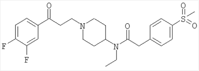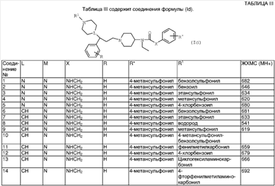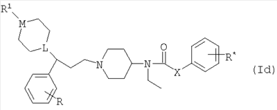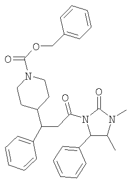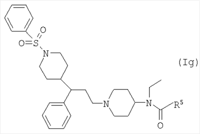 TMEDA (2,4 г) добавляли к суспензии иодида меди (I) (4,02 г) в THF (100 мл) и смесь перемешивали при комнатной температуре в течение 30 минут. Реакционную смесь охлаждали до -78°С и добавляли бромид фенилмагния (11,69 мл 1 М раствора в THF) и смесь перемешивали при -78°С в течение 30 минут. Трифлат дибутилбора (11,69 мл; 1 М раствор в диэтиловом эфире) добавляли к раствору 3-[3-(бензилоксикарбонилпиперидин-4-ил)акрилоил]-(4R,5S)-1,5-диметил-4-фенил-2-имидазолидинона (4,9 г) в THF (50 мл) и эту смесь добавляли по каплям в течение 10 минут к раствору купратного реагента. Реакционную смесь перемешивали при -78°С в течение 1 часа, затем оставляли нагреваться до температуры окружающей среды. Растворитель выпаривали, остаток растворяли в этилацетате и фильтровали через диоксид кремния (100 г). Этилацетатный раствор промывали 2 М HCI (1×100 мл), высушивали и упаривали досуха. Остаток пропускали через BondElut-колонку с элюированием смесью этилацетата и изогексана (1:1), что дало указанное в заголовке соединение в виде отдельного диастереоизомера согласно данным ЯМР. Выход 5,1 г. ЯМР (DMSOd6): 0.5 (d, ЗН), 0.8-1.1 (m, 2H), 1.3 (d, 1H), 1.7 (m, 2H), 2.6 (m, 5H), 2.85-3.1 (m, 4H), 5.05 (s, 2H), 5.2 (d, 1H), 6.8 (m, 2H), 7.1-7.5 (m, 13Н). 3-[3-(Бензилоксикарбонилпиперидин-4-ил)акрилоил]-(4R,5S)-1,5-диметил-4-фенил-2-имидазолидинон 1-Хлоро-N,N,2-триметил-1-пропениламин (1,37 г) по каплям добавляли в продолжение 10 минут к раствору 3-(бензилоксикарбонилпиперидин-4-ил)пропеновой кислоты (2,5 г) в THF (20 мл) и смесь перемешивали в течение 1,5 часа. Литийбис(триметилсилил)амид (8,65 мл) добавляли к раствору (4R,5S)-1,5-диметил-4-фенил-2-имидазолидинона (1,64 г) в THF (20 мл) при -10°С и смесь перемешивали при -10°С в течение 10 минут, оставляли нагреваться до 0°С и затем еще раз охлаждали до -10°С. По каплям добавляли раствор хлорангидрида кислоты (приготовленного, как указано выше) и смесь оставляли нагреваться до комнатной температуры. Реакционную смесь выливали в воду (100 мл) и экстрагировали этилацетатом (3×50 мл). Объединенные экстракты высушивали, упаривали досуха и остаток хроматографировали на BondElut-колонке с элюированием смесью этилацетат/изогексан (1:1), что дало указанное в заголовке соединение, выход 3,6 г. ЯМР (DMSOd6): 0.6 (d, 3Н), 0.95 (d, 1H), 1.2 (m, 2H), 1.55 (m, 2H), 2.4 (m, 1H), 2.3 (s, 3Н), 2.8 (m, 2H), 3.95 (m, 3Н), 5 (s, 2H), 5.3 (d, 1H), 6.9 (m, 1H), 7.1 (m, 2H), 7.2-7.4 (m, 8H). 3-(Бензилоксикарбонилпиперидин-4-ил)пропеновая кислота Смесь N-бензилоксикарбонил-4-формилпиперидина (10 г), малоновой кислоты (4, 2), пиридина (4 мл) и пиперидина (0,4 мл) нагревали при 100°С в течение 2 часов. Реакционную смесь оставляли охлаждаться и разбавляли этилацетатом (100 мл). Раствор промывали 2 М HCl (2×100 мл), высушивали и упаривали досуха. Остаток растирали с изогексаном, что дало указанное в заголовке соединение, выход 13,5 г. ЯМР (DMSOd6): 1.2 (m, 2H), 1.7 (m, 2H), 2.35 (m, 1Н), 2.85 (m, 2H), 4 (d, 2H), 5.05 (s, 2H), 5.75 (d, 1H), 6.75 (m, 1H), 7.35 (m, 5H), 12.25 (уширенный пик, 1H). ПРИМЕР 12 N-[1-3-[(3-Фторфенил)-3-[1-фенилпиперидин-4-ил]пропил)пиперидин-4-ил]-N-этил-4-метансульфонилфенилацетамид (Соединение №145 из Таблицы I) 2 М NaOH добавляли к суспензии соли дигидрохлорида N-[1-[3-(3-фторфенил-3-[пиперидин-4-ил]пропил)пиперидин-4-ил]-N-этил-4-метансульфонилфенилацетамида (0,85 г) в дихлорметане (25 мл) и смесь перемешивали до получения прозрачного раствора. Дихлорметановый раствор высушивали и фильтровали. К этому дихлорметановому раствору добавляли бензолбороновую кислоту (330 мг), триэтиламин (280 мг) и ацетат двухвалентной меди (276 мг). Реакционную смесь перемешивали в течение 15 часов, про
