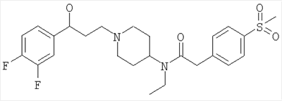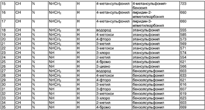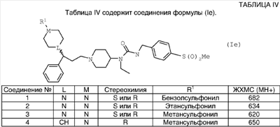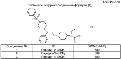 Пиперидин (6,84 г) растворяли в DCM (39 мл) и медленно добавляли TFA (39 мл). Смесь оставляли стоять в течение 40 минут и затем упаривали. Остаток растворяли в 2 М NaOH, экстрагировали DCM (3×150 мл) и экстракты высушивали над MgSO4, фильтровали и упаривали, что дало указанное в заголовке соединение в виде твердого вещества желтого цвета (5,00 г). ЯМР: (DMSO): 1.05 (t, 3Н), 1.41 (m, 4H), 2.42 (m, 2H), 2.96 (d, 2H), 3.20 (m, 5H), 3.90 (quint, 1H), 4.29 (d, 2H), 6.84 (t, 1H), 7.43 (d, 2H), 7.85 (d, 2H). МС 340 (МН+). Способ Е N-[1-(3-[3,4-Дифторфенил]-3-гидроксипропил)пиперидин-4-ил]-N-этил-4-метансульфонилфенилацетамид Раствор борогидрида натрия (7,7 мг) в этаноле (1 мл) добавляли к раствору N-[1-(3-[3,4-дифторфенил]-3-кетопропил)пиперидин-4-ил]-N-этил-4-метансульфонилфенилацетамида (0,25 г) в этаноле (3,2 мл) при 0°С в атмосфере аргона и реакционную смесь оставляли нагреваться до комнатной температуры в течение 20 часов. Реакцию гасили солевым раствором, экстрагировали три раза диэтиловым эфиром и объединенные экстракты сушили. Затем фильтрат концентрировали до получения прозрачного масла, выход 0,21 г. МС (МН+) 495. N-[1-(3-[3,4-Дифторфенил]-3-кетопропил)пиперидин-4-ил]-N-этил-4-метансульфонилфенилацетамид DBU добавляли к раствору [пиперидин-4-ил]-N-этил-4-метансульфонилфенилацетамида (CAS №374725-04-9) (320 мг) и 3,4-дифторфенилвинилкетона (654 мг) в дихлорметане (9 мл) в атмосфере аргона и реакционную смесь перемешивали в течение 36 часов. Реакционную смесь концентрировали in vacuo и очищали, используя колоночную флэш-хроматографию на диоксиде кремния с элюированием градиентом растворителей (метанол 10-15%, метанол в дихлорметане), выход 250 мг. МН+ 493. 3,4-Дифторфенилвинилкетон Реагент Десс-Мартина (3,18 г) добавляли к раствору 3,4-дифторвинилового спирта (CAS №149946-84-9) (1,18 г) в дихлорметане (22 мл) при 0°С в атмосфере аргона и реакционную смесь оставляли перемешиваться в течение 1 часа. Смесь наносили непосредственно на колонку для очистки путем колоночной флэш-хроматографии, элюируя градиентом (этилацетат -10%, этилацетат и изогексан), выход 654 мг. ЯМР (CDCl3): 6.0 (d, 1H), 6.50 (d, 1 Н), 7.10 (dd, 1 Н), 7.30 (m, 1 Н), 7.80 (m, 2H). ПРИМЕР 15 Способность соединений ингибировать связывание RANTES оценивали путем in vitro анализа связывания радиоактивного лиганда. Препарат мембран готовили из клеток яичника китайского хомячка, которые экспрессировали человеческий рецептор CCR5. Эти мембраны инкубировали с 0,1 нМ йодированным RANTES гранулами для определения сцинтилляционной близости и соединениями по изобретению в различных концентрациях в 96-луночных планшетах. Количество йодированного RANTES, связавшегося с рецептором, определяли на основании счета сцинтилляций. Получили кривые конкуренции для соединений и рассчитывали концентрации соединений, которые замещали 50% связанного йодированного RANTES (IC50). Предпочтительные соединения формулы (I) имели IC50 менее 50 мкМ. ПРИМЕР 16 Способность соединений ингибировать связывание MIP-1 Результаты этого теста для некоторых соединений по изобретению представлены в Таблице VII. Результаты в Таблице VII представлены в виде значений Pic50. Значение Pic50 представляет собой отрицательный логарифм (по основанию 10) полученного значения IC50, таким образом IC50, равная 1 мкМ (то есть 1×10-6 М), дает Pic50, равный 6. Если соединение тестировали более одного раза, то приведенные ниже данные представляют собой среднее значение результатов предназначенных для испытания проб.