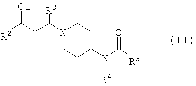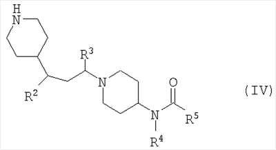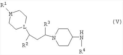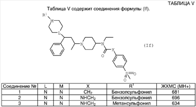 где R1 такой, как он определен выше, в присутствии иодида натрия и подходящего основания (например, три(С1-6алкил)амина, такого как триэтиламин или основание Хюнига) в подходящем растворителе (таком как хлорсодержащий растворитель, например дихлорметан) и, например, при комнатной температуре (например 10-30°С). Соединение по изобретению, где L представляет собой СН, может быть получено путем взаимодействия соединения формулы (IV) где R2, R3, R4 и R5 такие, как они определены выше, со следующим, в зависимости от того, какое соединение по изобретению желательно получить: а) с кислотой формулы R1CO2H в присутствии подходящего агента сочетания (например, PyBrOP [бромо-трис-пирролидинофосфонийгексафторфосфат] или HATU) в присутствии подходящего основания (такого как три(С1-6алкил)амин, например диизопропилэтиламин) в подходящем растворителе (например, N-метилпирролидиноне или хлорсодержащем растворителе, как, например, дихлорметан) при комнатной температуре (например 10-30°С); б) с хлорангидридом кислоты формулы R1C(O)Cl или сульфонилхлоридом формулы R1C(O)2Cl в присутствии подходящего основания (такого как три(С1-6алкил)амин, например триэтиламин или диизопропилэтиламин) в подходящем растворителе (например, хлорсодержащем растворителе, таком как дихлорметан) при комнатной температуре (например 10-30°С) или в) с альдегидом формулы R1CHO в присутствии NaBH(ОАс)3 (где Ас представляет собой С(О)СН3) и уксусной кислоты в подходящем растворителе (таком как C1-6алифатический спирт, например этанол) при комнатной температуре (например 10-30°С). Альтернативно соединение по изобретению может быть получено путем сочетания соединения формулы (V) где L, M, R1, R2, R3 и R4 такие, как они определены выше, с: а) кислотой формулы R5CO2H в присутствии подходящего агента сочетания (например, PyBrOP или HATU) в присутствии подходящего основания (как, например, три(С1-6алкил)амин, например диизопропилэтиламин) в подходящем растворителе (например, N-метилпирролидиноне или хлорсодержащем растворителе, таком как дихлорметан) при комнатной температуре (например 10-30°С) или б) хлорангидридом кислоты формулы R5C(O)Cl в присутствии подходящего основания (такого как три(С1-6алкил)амин, например триэтиламин или диизопропилэтиламин) в подходящем растворителе (например, хлорсодержащем растворителе, таком как дихлорметан) при комнатной температуре (например 10-30°С). Исходные материалы для этих способов либо имеются в продаже, либо могут быть получены способами, описанными в литературе, либо адаптированием способов, описанных в литературе, или приведенными далее здесь Способами или адаптированием описанных здесь Способов. В дополнительном аспекте данного изобретения предложено промежуточное соединение формулы (V). В еще одном дополнительном аспекте данного изобретения предложены способы получения соединений формулы (I), (Ia), (Ib), (Ic), (Id), (Ie), (If) и (Ig). Многие промежуточные соединения в данных способах являются новыми, и они предложены в качестве дополнительных объектов данного изобретения. Соединения по изобретению обладают активностью как фармацевтические средства, в частности как модуляторы (например, агонисты, частичные агонисты, обратные агонисты или антагонисты) активности рецепторов хемокинов (в частности, CCR5), и могут применяться при лечении аутоиммунных, воспалительных, пролиферативных или гиперпролиферативных заб