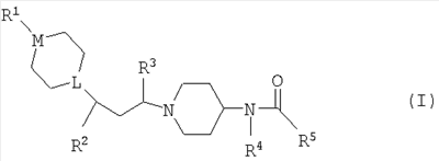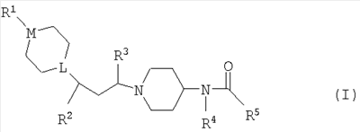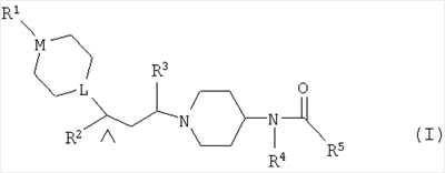 1. Производное пиперидина формулы (I): где L представляет собой CH или N; М представляет собой СН или N; при условии, что L и М оба не представляют собой СН; R1 представляет собой фенил (возможно замещенный галогено или C1-4алкилом), S(O)2(С1-4алкил), S(O)2(С1-4фторалкил), S(O)2фенил (возможно замещенный CF3 или OCF3), бензил, бензоил (возможно замещенный галогено) или С(O)NHфенил (возможно замещенный галогено); R2 представляет собой фенил, возможно замещенный галогено; R3 представляет собой водород или С1-4алкил; R4 представляет собой метил или этил; R5 представляет собой фенил-NH, фенил(С1-2алкил), фенил(С1-2алкил)-NH или пиридил(С1-2алкил), при этом фенильное кольцо возможно замещено галогено, циано, С1-4алкилом, С1-4алкокси, S(O)k(С1-4алкил) или S(O)2NR8R9; k равно 2; R8 и R9 независимо представляют собой водород; или его фармацевтически приемлемая соль. 2. Соединение по п.1, где L представляет собой СН. 3. Соединение по п.1 или 2, где М представляет собой N. 4. Соединение по п.1, где R3 является водородом или метилом. 5. Соединение по п.1, где R4 является этилом. 6. Способ получения соединения по п.1, где L представляет собой N, при котором осуществляют взаимодействие соединения формулы (II): где R2, R3, R4 и R5 такие, как определено в п.1, с соединением формулы (III):