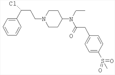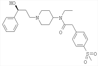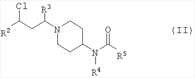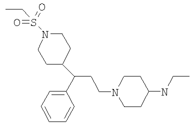 Смесь N-этил-N-[1-(3-фенил)-3-{1-(этансульфонилпиперидин-4-ил)пропил}пиперидин-4-ил]карбаминовой кислоты бензилового эфира (5 г) и 10%-ного палладия на углероде (2 г) в этаноле (200 мл) гидрировали в атмосфере водорода, используя наполненный водородом баллон. Катализатор отфильтровывали и фильтрат упаривали досуха с получением указанного в заголовке соединения, выход 2,78 г. N-Этил-N-[1-(3-фенил-3-{1-(этансульфонилпиперидин-4-ил)пропил}пиперидин-4-ил]карбаминовой кислоты бензиловый эфир Этансульфонилхлорид (2,3 г) добавляли к раствору N-этил-N-[1-(3-фенил)-3-{(пиперидин-4-ил)пропил}пиперидин-4-ил]карбаминовой кислоты бензилового эфира дигидрохлорида (8,5 г) и триэтиламина (4,8 г) в дихлорметане (200 мл), выдерживаемому при 0°С. Реакционную смесь оставляли нагреваться до комнатной температуры и перемешивали в течение 4 часов. Реакционную смесь промывали 2 М NaOH (2×100 мл), сушили и упаривали досуха. Остаток хроматографировали на BondElut-колонке с элюированием градиентом растворителей (этилацетат – 20%-ный метанол/этилацетат), что дало указанное в заголовке соединение, выход 5 г. ЯМР (DMSOd6): 1 (t, 3Н), 1.1 (t, 3H), 1.3-3 (m, 14H), 2.2 (m, 1H), 2.55-2.9 (m, 5H), 2.95 (q, 2Н), 3.1 (q, 2H), 3.4-3.7 (m, 3Н), 5.05 (s, 2H), 7.1-7.4 (m, 10Н). МС (МН+) 556. Дигидрохлорид N-этил-N-[1-(3-фенил)-3-{(пиперидин-4-ил)пропил}пиперидин-4-ил]карбаминовой кислоты бензилового эфира HCI в диоксане (50 мл, 4 М) добавляли к бензиловому эфиру N-этил-N-[1-(3-фенил)-3-{1-(трет-бутилоксикарбонилпиперидин-4-ил)пропил}пиперидин-4-ил]карбаминовой кислоты (26 г) при 0°С, смесь оставляли нагреваться до комнатной температуры и перемешивали в течение 2 часов. Реакционную смесь разбавляли диэтиловым эфиром (200 мл) и выпавшую в осадок твердую соль – дигидрохлорид – отфильтровывали и высушивали (гигроскопична). Выход 17 г. MC (MH+) 464. N-Этил-N-[1-(3-фенил)-3-{1-(трет-бутилоксикарбонилпиперидин-4-ил)пропил}пиперидин-4-ил]карбаминовой кислоты бензиловый эфир Раствор 3-фенил-3-(1-трет-бутилоксикарбонилпиперидин-4-ил)пропионового альдегида (7,8 г) [приготовленного согласно описанному в Примере 11 способу] в дихлорметане (200 мл) добавляли к смеси гидрохлорида N-этил-N-пиперидин-4-илкарбаминовой кислоты бензилового эфира (7,4 г) (CAS №220395-87-9) и ацетата натрия (2,17 г) в этаноле (50 мл) и перемешивали в течение 30 минут. Триацетоксиборогидрид натрия (5,2 г) добавляли небольшими порциями в течение 15 минут и перемешивание продолжали в течение 2 часов. По каплям добавляли водный NaOH (2 M, 200 мл), дихлорметановый слой собирали и промывали 2 M NaOH (2×100 мл), высушивали и упаривали досуха, что дало указанное в заголовке соединение, выход 26 г. ЯМР (DMSOd6): 1 (t, 3Н), 1.35 (s, 9H), 1.4-2 (m, 14H), 2.3 (m, 2H), 2.6-2.7 (m, 4Н), 3.15 (q, 2H), 3.4-4 (m, 3Н), 5.05 (s, 2H), 7.1-7.2 (m, 10Н). МС (МН+) 563. 4-Метансульфонилфенилметилизоцианат Дифенилфосфорилазид (260 мг) добавляли к смеси 4-метансульфонилфенилуксусной кислоты (200 мг) и триэтиламина (191 мг) в THF (20 мл) и реакционную смесь кипятили с обратным холодильником в течение 4 часов. Реакционную смесь охлаждали и использовали непосредственно на следующей стадии. Способ А N-[1-(3-Фенил-3-хлорпропил)пиперидин-4-ил]-N-этил-4-метансульфонилфенилацетамид Стадия 1: получение N-[1-(3-фенил-3-оксопропил)пиперидин-4-ил]-N-этил-4-метансульфонилфенилацетамида К раствору N-(4-пиперидинил)-N-этил-4-метансульфонилфенилацетамида (Способ В; 3,24 г, 10 ммоль) в DMF (50 мл) добавляли карбонат калия (2,76 г, 20 ммоль) с последующим добавлением 3-хлорпропиофенона (1,85 г; 11 ммоль). Получающуюся смесь перемешивали при комн