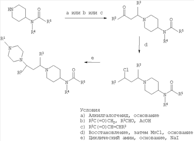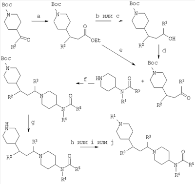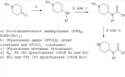СХЕМА 1 СХЕМА 2 СХЕМА 3 Условия а) (1) (EtO)2P(=O)CH2CO2Et, основание; (2) гидрирование (например, Pd(OH)2, H2) b) Восстановление (например, LiAlH4) (R3 представляет собой Н) c) (1) Восстановление до альдегида (например, DIBAL-H); (2) R3MgBr d) Окисление (например, реагент Десс-Мартина) e) (1) MeONHMe, AlMe3; (2) восстановление (R3 представляет собой Н) или R3MgBr f) Восстановительное аминирование (NaBH(ОАс)3, АсОН) g) HCl или TFA h) Образование амида (кислота и агент сочетания или галогенангидрид кислоты, основание) i) Образование сульфонамида (сульфонилхлорид, основание) j) Восстановительное аминирование (альдегид, NaBH(ОАс)3)