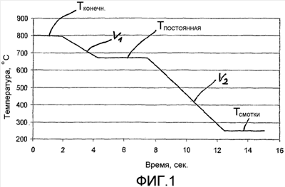 Изобретение относится к способу изготовления горячекатаной полосы с двухфазной структурой из феррита и мартенсита. Для получения горячекатаной полосы (10) с двухфазной структурой из 70-95% феррита и 30-5% мартенсита, с высокой механической прочностью и высокой деформируемостью, пределом прочности при растяжении свыше 600 МПа и относительном удлинении при разрыве, по меньшей мере, 25%, полосу, выполненную из стали с химическим составом 0,01-0,08% углерода, 0,9% кремния, 0,5-1,6% марганца, 1,2% алюминия, 0,3-1,2% хрома, остальное железо, а также неизбежные примеси после прокатки охлаждают в две ступени на охлаждающем тракте литейно-прокатной установки, с конечной температуры прокатки Тконечн при А3-100К<Тконечн<А3– до температуры намотки полосы Тсмотки<300°C, т.е. ниже температуры начала мартенситного превращения, причем скорость V1,2 охлаждения на обеих ступенях охлаждения составляет V=30-150 K/c, преимущественно V=50-90 K/c, причем первую ступень охлаждения осуществляют вплоть до захода кривой охлаждения в ферритную область, а затем высвобожденную в результате превращения аустенита в феррит теплоту превращения используют для изотермической выдержки достигнутой температуры Тпостоянная полосы с временем выдержки 5 с вплоть до начала второй ступени охлаждения. 2 н. и 2 з.п. ф-лы, 3 ил.