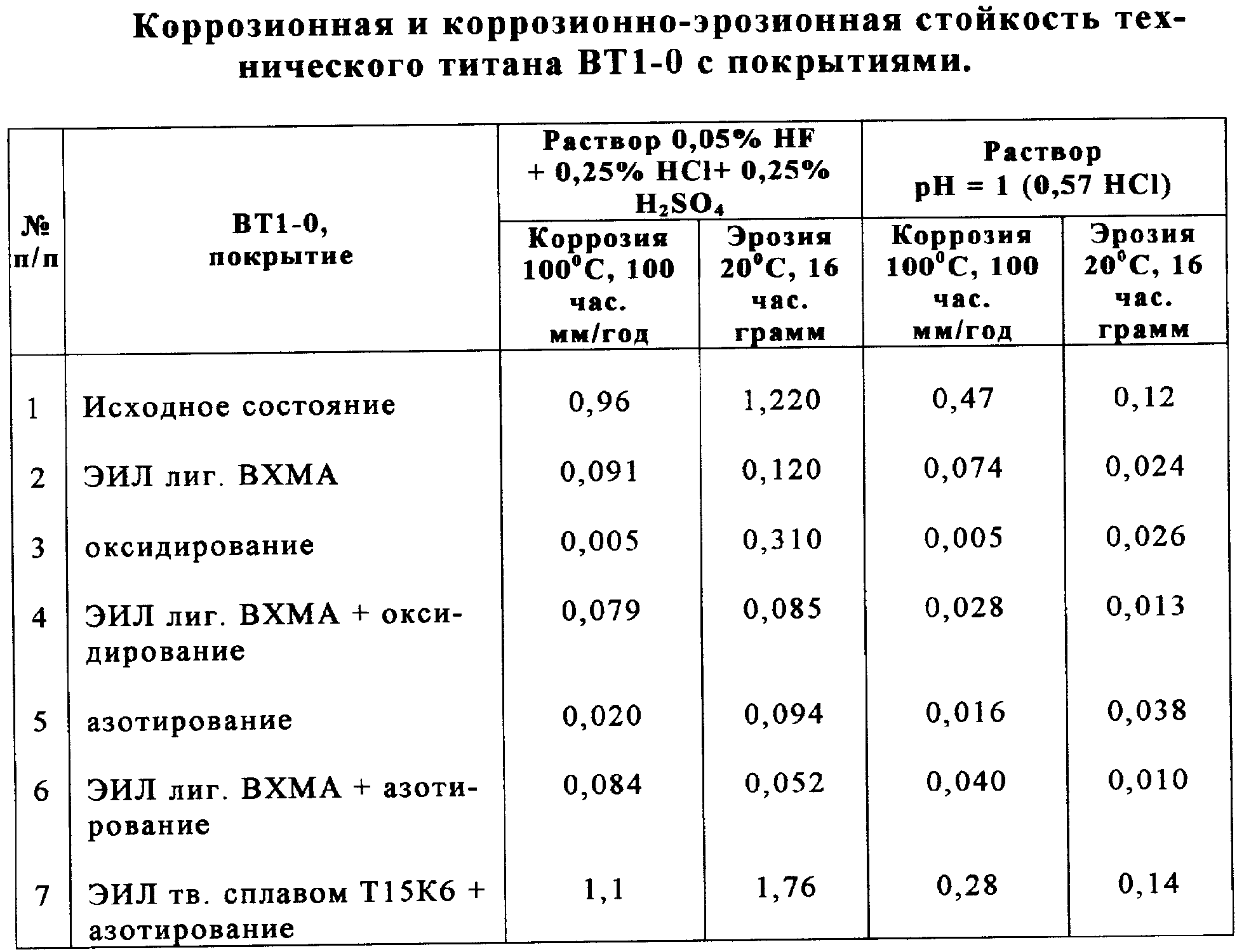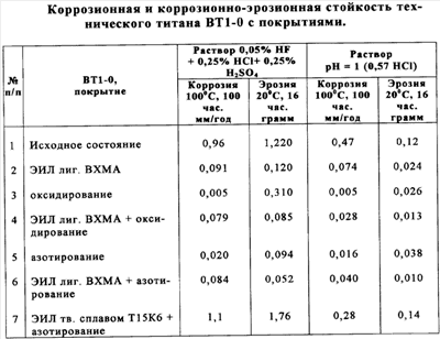 В таблице 1 приведены данные по коррозионной и коррозионно-эрозионной стойкости различных вариантов покрытий и их сочетаний на ВТ1-0.