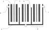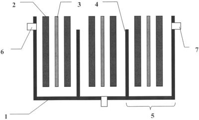 Устройство состоит из полимерного корпуса 1, в котором расположены графитовые аноды 2 и титановые катоды жалюзийного типа 3. Внутреннее пространство электролизера разделено полимерными перегородками 4 на ячейки 5, в каждой из которых расположен между двумя анодами 2 катод 3. В электролизере имеются патрубки подачи электролита 6 и выхода электролита 7.