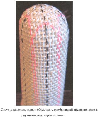 Цельнотканая оболочка состоит из комбинации двухниточного переплетения, используемого на участках с нулевой кривизной поверхности, и трехниточного переплетения, образующего участки оболочки с кривизной, отличной от нуля, и включающего три системы основных нитей и дополнительные формообразующие нити.