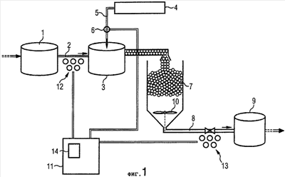 Для выполнения процесса обучения на отводящем трубопроводе 8 расположен следующий чувствительный элемент белизны 13, который соединен с блоком управления 11. В режиме адаптации теперь можно определять отбеливающее действие добавленного отбеливающего средства в соответствующей концентрации, количестве и составе и изготавливать или, соответственно, юстировать схему соответствия, чтобы оптимировать управление процессом отбеливания. В режиме адаптации отклонения от желательной заданной белизны и действительно достигнутую белизну на отводящем трубопроводе 8 емкости для отбеливания 7 можно применять, например, для определения рассогласования.