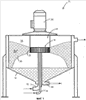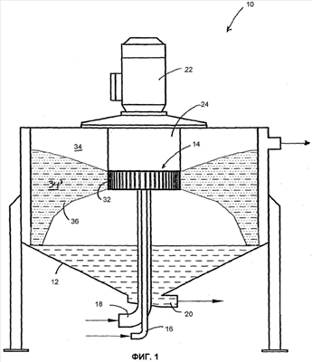 На Фиг.1 изображен осадительный реактор 10 непрерывного действия согласно изобретению, содержащий: осадительный резервуар 12; измельчающее и активизирующее устройство 14, установленное в осадительном резервуаре; питающий трубопровод 16 для подачи волокнистой суспензии; питающий трубопровод 18 для подачи осадительного газа; питающий трубопровод 20 для отвода обработанной волокнистой суспензии. Кроме того, устройство состоит из привода 22, содержащего подшипниковый и сальниковый узел 24, расположенный между приводом 22 и устройством 14.