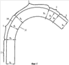 Изменение ширины рельсовой колеи железнодорожного пути, как правило, проводят в переходных 1 кривых, от прямого участка 2 пути с шириной рельсовой колеи Sп до участка пути круговой 3 кривой с шириной рельсовой колеи Sк, плавно увеличивая ширину колеи Si, и аналогично от участка пути круговой кривой до прямого участка, плавно уменьшая ширину рельсовой колеи. И в том и другом случае используется один и тот же способ и те же элементы скрепления. Для этого используют железобетонные подрельсовые основания 4, например шпалы, с анкерными рельсовыми скреплениями, которые имеют забетонированную (замоноличенную) в тело шпалы анкерную деталь 5 (или две детали, имеющие отдельные головки с каждой стороны рельса) с выступающими из бетона упорными поверхностями 6. В рельсовом скреплении имеются нарельсовые вкладыши 7 с вертикальной полкой 8, размещенной между подошвой 9 рельса и упорной поверхностью 6 анкерной детали 5.