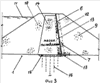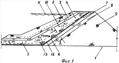Плотина возводится послойно, а размещение геотекстиля 6 в плотине осуществляется, например, посредством устанавливаемых в ряд переставных по высоте плотины инвентарных консольных щитов. При этом геотекстиль на время его присыпки закрепляют на гладких, покрытых слоем консистентной смазки поверхностях щитов [3].