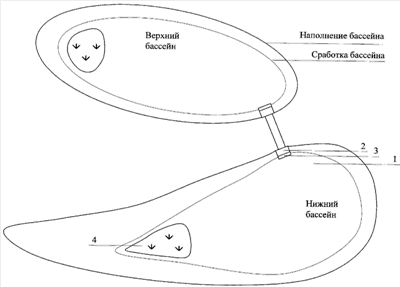 Способ обеспечения безопасности рыб на ГАЭС реализуют идентично как в верхнем, так и в нижнем бассейнах. Так, в нижнем бассейне 1 устраивают водоприемник ГАЭС 2. Водоприемник 2 оборудуют рыбозащитным устройством 3, с помощью которого предотвращают затягивание в него рыб при сработке бассейна 1, т.е. при работе водоприемника 2 в качестве водозабора. При этом удерживают рыб в зоне непосредственного действия водоприемника 2, например, с помощью восходящих водяных струй, перераспределяют из верхнего рыбообитаемого слоя водозаборного течения в поверхностную, комфортную, относительно безопасную зону, накапливают и удерживают их в ней на протяжении всего периода сработки бассейна 1. По окончании сработки бассейна 1 в нем обеспечивают свободное обитание рыб перед водоприемником 2. Наполнение бассейна 1 осуществляют, когда через водоприемник 2 организуют обратное течение воды. С помощью этого течения, которое используют в качестве рыбоотводящего, рыб принудительно отводят от водоприемника 2 и доставляют на удаленные от него участки 4 бассейна 1, на которых создают благоприятные условия для обитания рыб и удержания их от дальнейшего ската в водозабор. При последующих сработках бассейна рыб удерживают на участках 4 от ската в водоприемник 2.