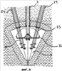 На Фиг.2а-2j показан способ создания многосвайного фундамента 20, в котором скважину 2 под фундаментную сваю 3 бурят первым шнековым буром 4, в указанное отверстие 2 устанавливают фундаментную трубу 3, бурят следующий участок 5 под нижним концом 6 установленной фундаментной трубы 3, в участке 5 выполняют полость 7 посредством скребка 8 и воды под давлением, рыхлый грунт из полости 7 удаляют шнековым буром 4, в нижнюю часть 10 участка 5 опускают трубу 9 для инструментов и приспособлений, в которой размещен шнековый бур 11 с эластичной оболочкой 12, охватывающей нижний конец 13 бура 11, в верхней части 22 полости 7 высверливают несколько отверстий 21, в каждое из которых может быть введена дополнительная фундаментная труба 24, с несколькими армирующими устройствами 23, входящими в указанную полость 7, через фундаментную трубу 3 опускают армирующее устройство 16, в фундаментные трубы 3, 24 заливают бетонный материал, вследствие чего указанная полость 7 заполняется, указанные блоки арматуры 16, 23 закладывают в залитый бетон 17, обеспечивая указанным фундаментным трубам 3, 24 уширенную подошву 25.