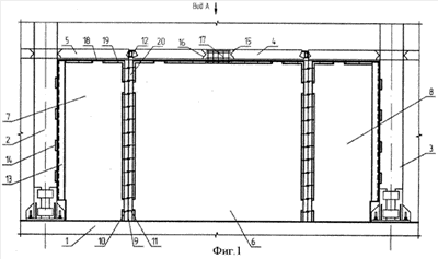 Предлагаемая конструкция поясняется чертежами, где на фиг.1 изображен фрагмент здания с диафрагмой, на фиг.2 – вид по стрелке А на фиг.1. Каркасное безригельное здание содержит основание 1, колонны 2, 3, плиты 4, 5 перекрытий, железобетонные диафрагмы, установленные между колоннами 2, 3, основанием 1, межколонными 4 и надколонными 5 плитами перекрытий, соединенных между собой с помощью закладных элементов и арматурных стержней. Диафрагма выполнена из центральной 6 и двух боковых частей 7, 8, соединенных между собой в одной вертикальной плоскости, при этом ширина центральной части 6 диафрагмы равна длине межколонной плиты 4 перекрытия. Центральная часть 6 диафрагмы с трех сторон – верхней и двух боковых, а каждая боковая часть 7, 8 диафрагмы с двух сторон – верхней и боковой со стороны центральной части 6 диафрагмы снабжены петлеобразными выпусками. Центральная часть 6 боковыми сторонами соединена с боковыми частями 7, 8 с помощью арматурных стержней 9, установленных между плит 4, 5 перекрытий вертикально в образованных при стыковке частей петлевыми выпусками 10, 11 навстречу друг другу отверстиях, причем концы этих арматурных стержней расположены в шпоночных швах 12 соединений межколонных 4 и надколонных 5 плит перекрытия. Каждая боковая часть 7, 8 диафрагмы со стороны колонны снабжена закладными П-образными элементами 13, а колонны, между которыми установлена диафрагма, снабжены пластинчатыми закладным элементами 14, расположенными напротив П-образных закладных элементов боковых частей диафрагмы, и жестко связаны с ними. В каждой межколонной плите 4 перекрытия, расположенной над центральной частью 6 диафрагмы, выполнено квадратное отверстие 15, окантованное уголком 16 и содержащее дополнительный крепежный элемент, выполненный в виде двух сеток 17 Г-образной формы, связанных с уголком 16 и петлеобразными выпусками центральной части диафрагмы. Средняя диафрагмы 6 соединена с боковыми частями 7, 8 диафрагмы с помощью арматурных стержней 18, пропущенных горизонтально через отверстия всех верхних арматурных выпусков 19 всех частей 6, 7, 8 диафрагмы, кроме того, шпоночные швы 20 между частями диафрагмы и примыкающие к ним шпоночные швы 12 плит перекрытия, а также соединения межколонной плиты 4 и диафрагмы замоноличены бетоном. Монтаж каркасного безригельного здания проводится следующим образом. Предварительно организовывают основание 1 (фундаментная плита, либо плиты перекрытий), устанавливают колонны 2, 3. Затем устанавливают боковые части 7, 8 диафрагмы и прикрепляют их к колоннам 2, 3, соединяя закладными П-образными элементами 13 боковых частей 7, 8 диафрагмы с пластинчатыми закладными элементами 14 колонн 2, 3 при помощи сварки. Затем устанавливают среднюю часть 6 диафрагмы и соединяют ее с боковыми частями с помощью арматурных стержней 9. Одновременно устанавливают арматурные стержни 18 через отверстия всех верхних арматурных выпусков 19 всех частей 6, 7, 8 диафрагмы. Каждая часть диафрагмы фиксируется монтажными подкосами, которые снимают после замоноличивания горизонтальных и вертикальных швов. Затем монтируется верхнее поле плит перекрытия 4, 5. Организовывается узел, содержащий квадратное отверстие 15, окантованное уголком 16 и содержащее дополнительный крепежный элемент, выполненный в виде двух сеток 17 Г-образной формы, связанных с уголком 16 и петле